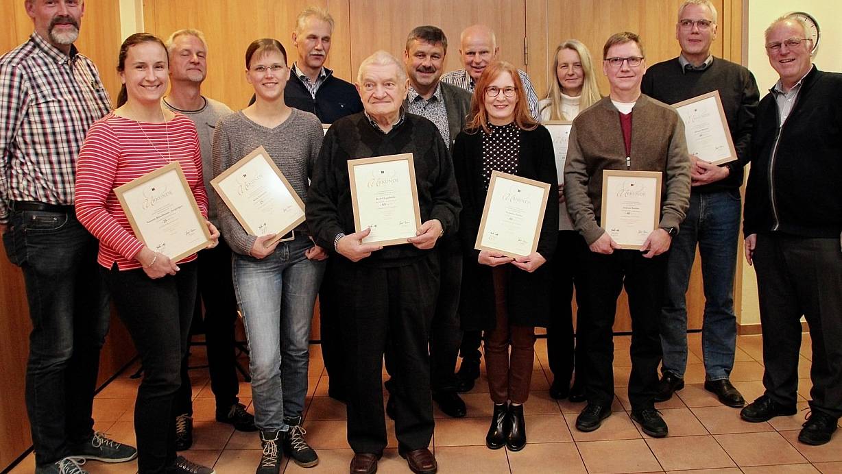 Arno Symann und Dietmar Esken bedankten sich bei insgesamt 21 Jubilaren für langjährige Mitgliedschaft. Besonders freuten sie sich, an diesem Abend Rudolf Landwehr begrüßen zu können. „Rudolf ist eines der Mitglieder, die bis heute die Kolpingsfamilie Kaunitz prägen", sagte Esken. Der Jubilar ist bereits seit 65 Jahren Mitglied und hat die Gemeinschaft in seiner aktiven Zeit als selbstständiger Tischlermeister stets großzügig mit Material und Handwerkszeug versorgt.