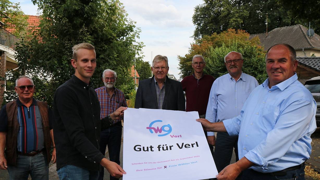 Bernhard Schmöller (von links), Jonas Pollmeier, Paul Tillmann, Udo Maik, Dieter Börchers, Paul Hermreck und Helmut Kosfeld präsentieren die 19 Kandidaten und den Wahlspruch der FWG für die nächste Kommunalwahl. | © Robert Becker
