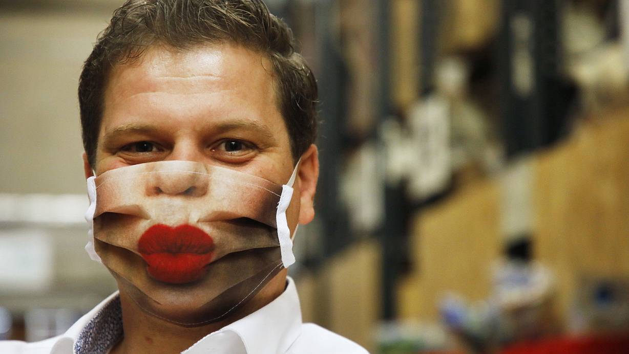 Sebastian Schmelter mit einem Verkaufshit: dem Mund-Nase-Schutz mit dem Motiv „Kussmund“. | © Roland Thöring