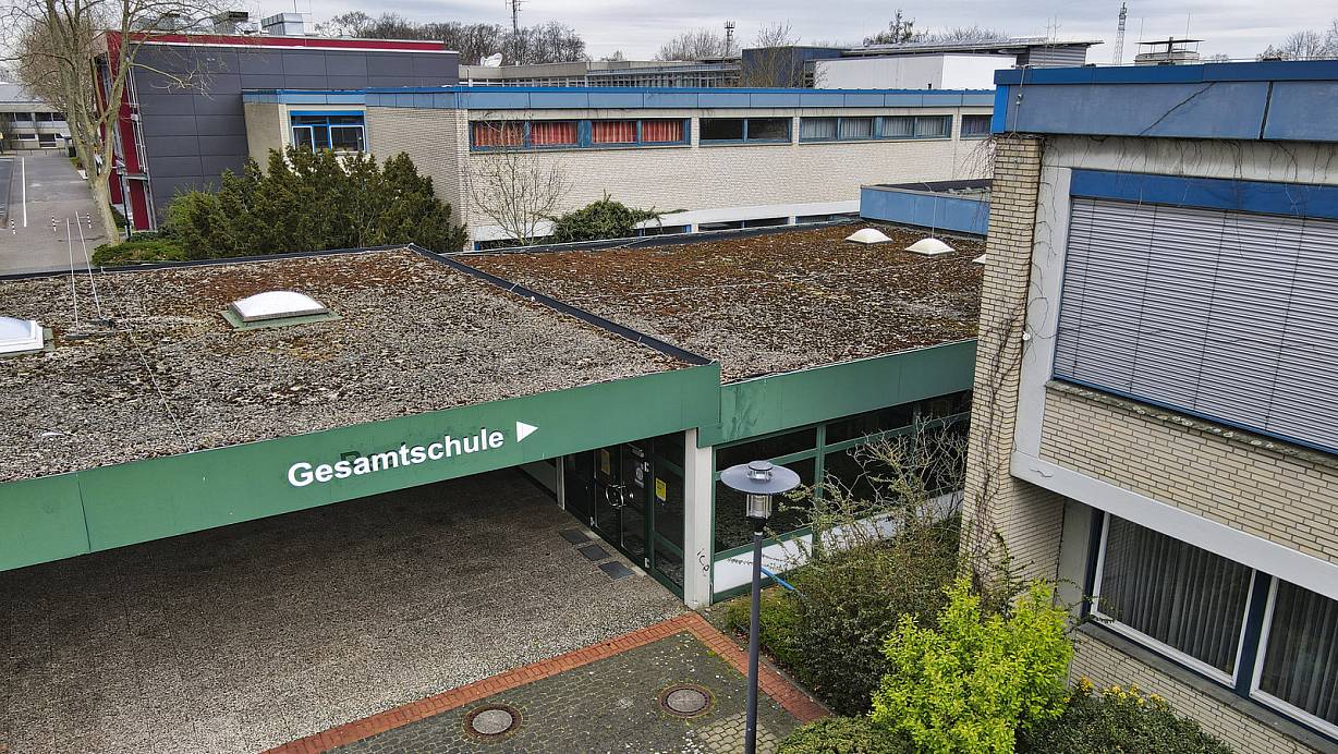 Ungefähr im Bereich zwischen der Schulzentrumsmensa im Hintergrund und dem überdachten früheren Eingang der Realschule wird der Neubau mit dem großen Veranstaltungsraum errichtet. | © Roland Thöring