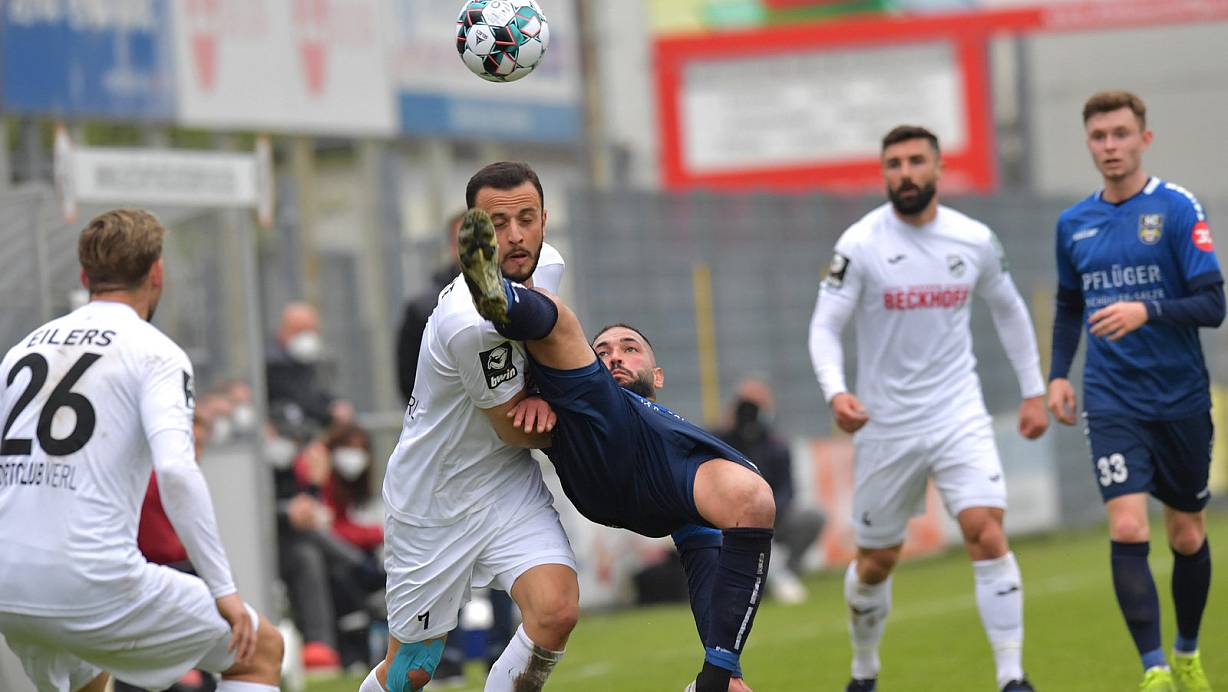 Bei diesem Fallrückzieherversuch trifft der Wiedenbrück Saban Kaptan den von hinten kommenden Verler Mehmet Kurt am Mund, was zu einer blutenden Verletzung und zur Gelben Karte für Kaptan führt. | © Jens Dünhölter