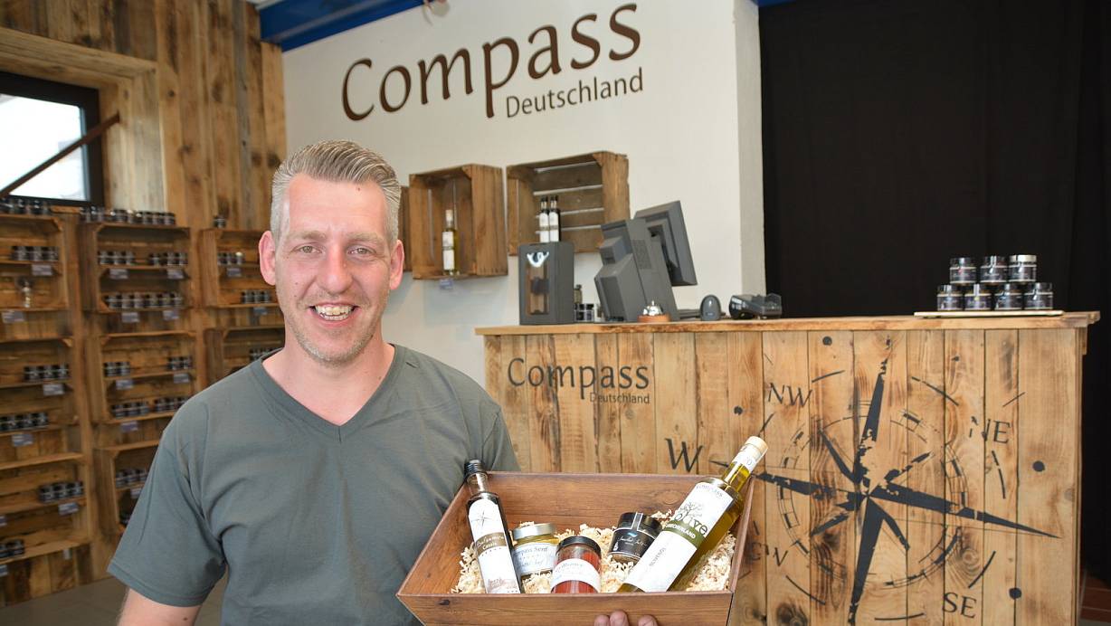 Tobias Stiller in den Geschäftsräumen an der Fürstenstraße in Kaunitz. Der 39-Jährige zeigt eine Auswahl der insgesamt 300 Produkte, die er und sein Partner Christian Graute mittlerweile anbieten. | © Karin Prignitz