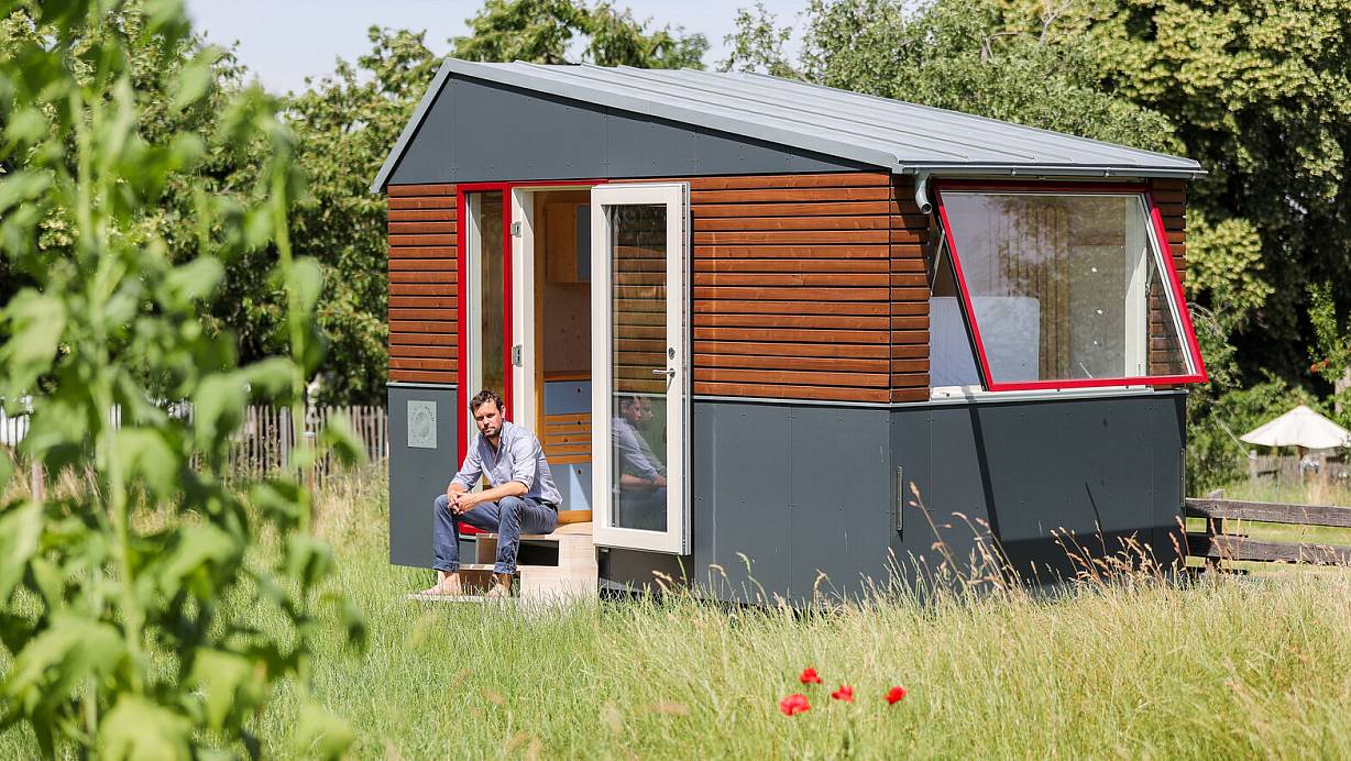 "Tiny-House" nennt man ein solch kleines Gebäude, vor dem Sascha Wagner sitzt. Die Grünen wollten wissen, ob es für diese minimalistische Wohnform auch in Verl Grundstücke geben könnte. | © picture alliance/dpa/dpa-Zentralbild