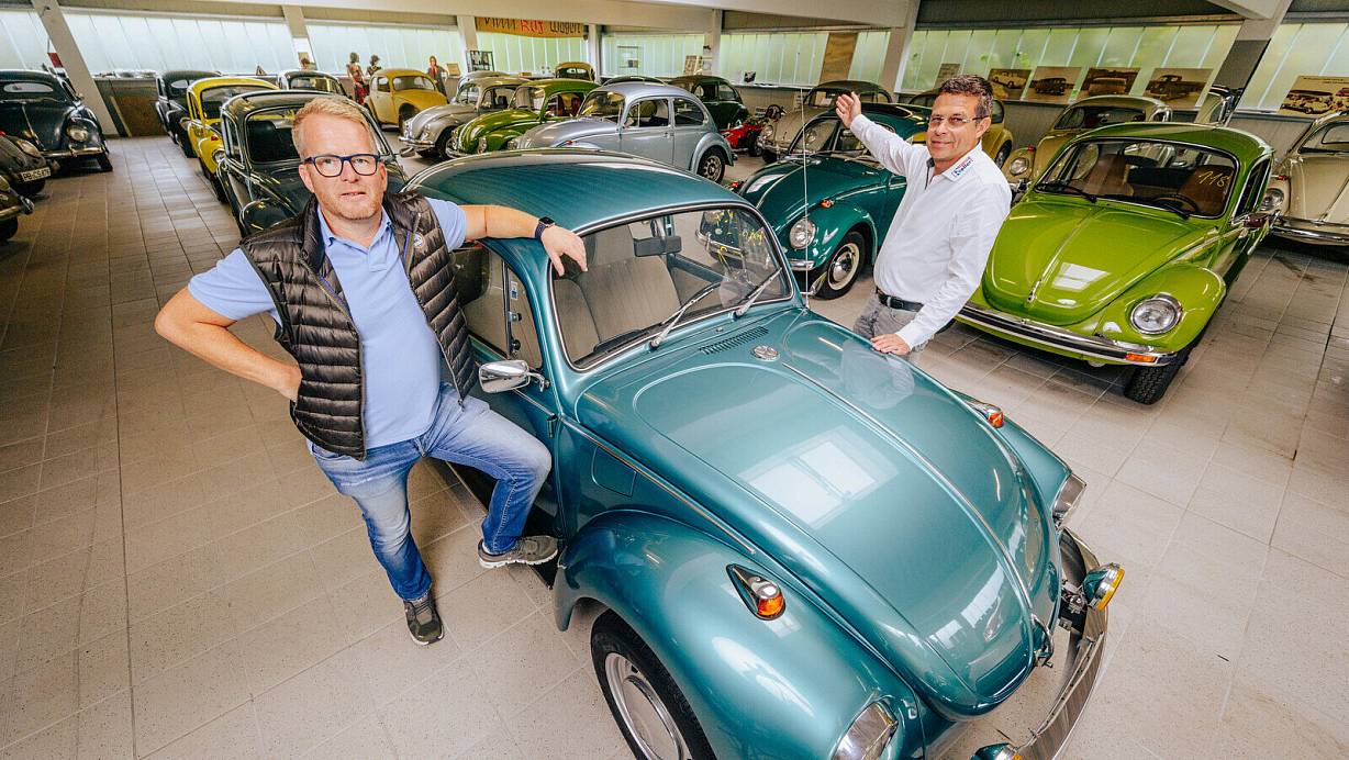 Käfer-Museum Verl-Kaunitz: Ralf Reller und Hubertus Bettenworth am Käfer, den ABBA-Musiker Björn Ulvaeus gefahren hat | © Besim Mazhiqi