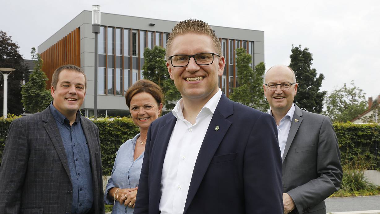 Robin Rieksneuwöhner (vorne) möchte sich um die Nachfolge von Michael Esken (r.) als Bürgermeister der Stadt Verl bewerben. Hinter ihm stehen CDU-Vorsitzender Sebastian Dahlkötter und die Chefin der Ratsfraktion Gabriele Nitsch. | © Roland Thöring