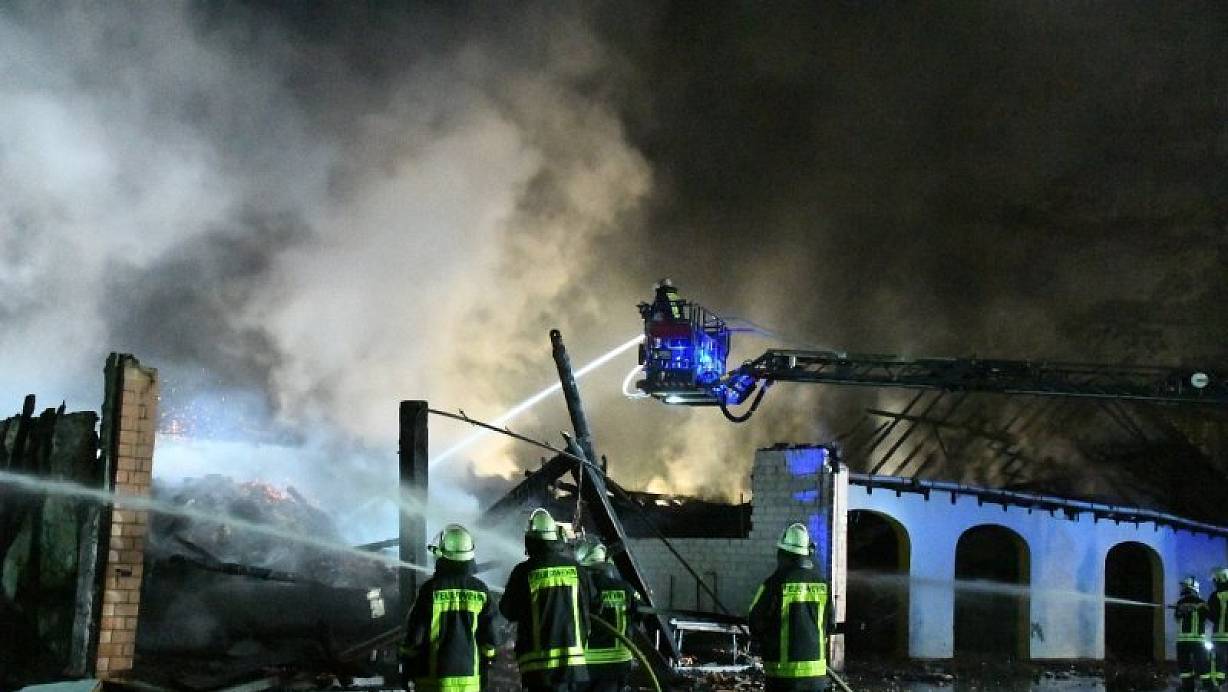Offenbar hatte der Brand aber schon lange Zeit gewütet, ehe er entdeckt worden war. „Als wir hier eintrafen, stürzten Teile des Daches bereits ein, berichtete Fuest. Von allen Seiten wurde der Brand in der etwa 40 Meter langen und zehn Meter tiefen Scheune bekämpft.