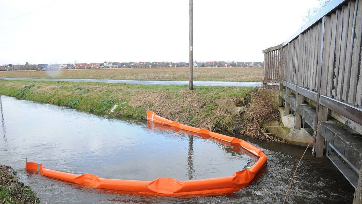 Die Feuerwehr setzte Ölsperren, um eine Verunreinigung des Aabachs einzudämmen. Die starke Fließgeschwindigkeit machte das nicht einfach, größerer Schaden am Gewässer konnte dennoch abgewendet werden. | © Marc Uthmann