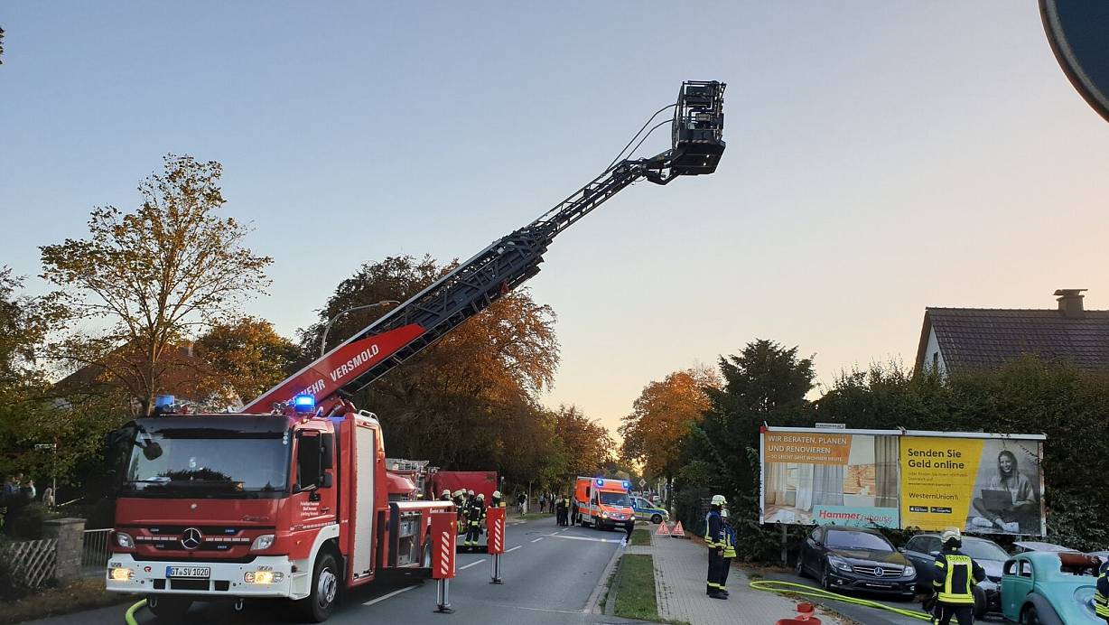 Straße in Versmold völlig aus. Auch die Drehleiter kam dabei zum