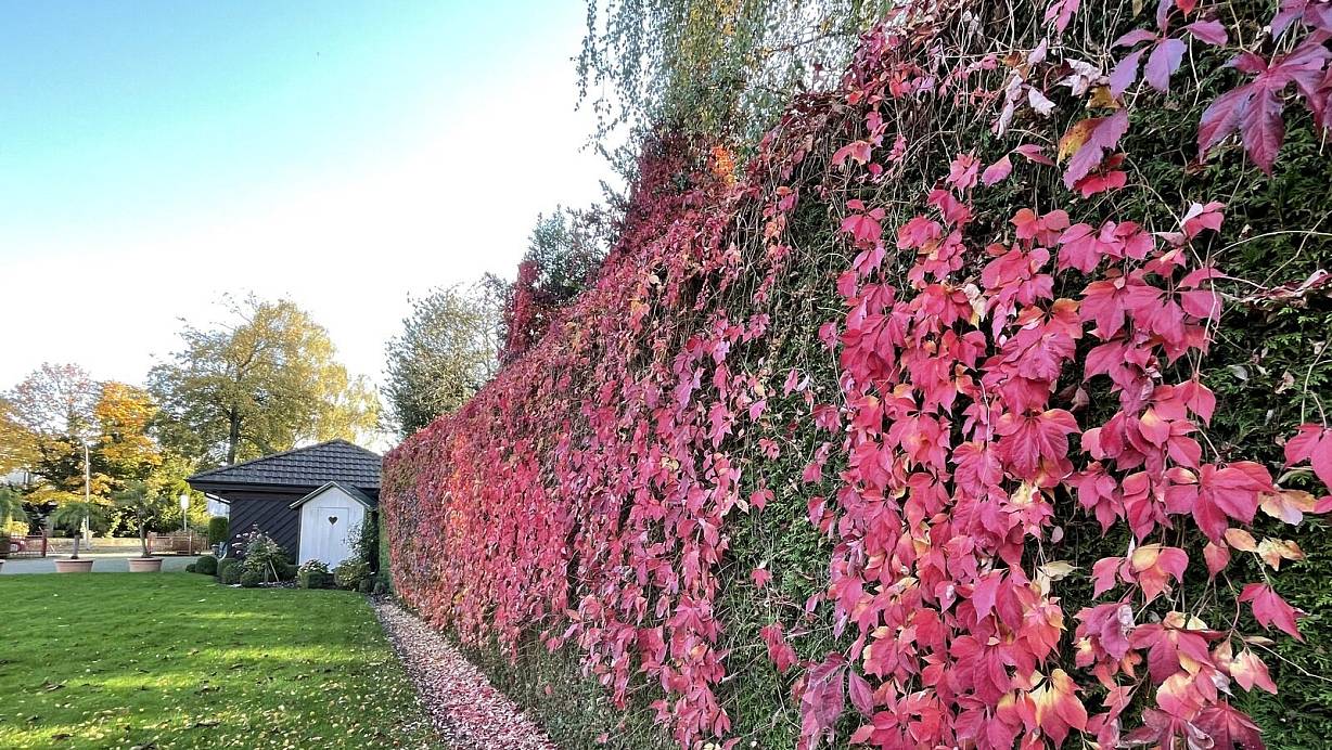 Die prächtige Lebensbaumhecke ist überzogen von einem Teppich aus Wildem Wein. Jedes Jahr im Herbst freut sich Gartenbesitzerin Gerda Nagel über dieses Bild. | © Tasja Klusmeyer