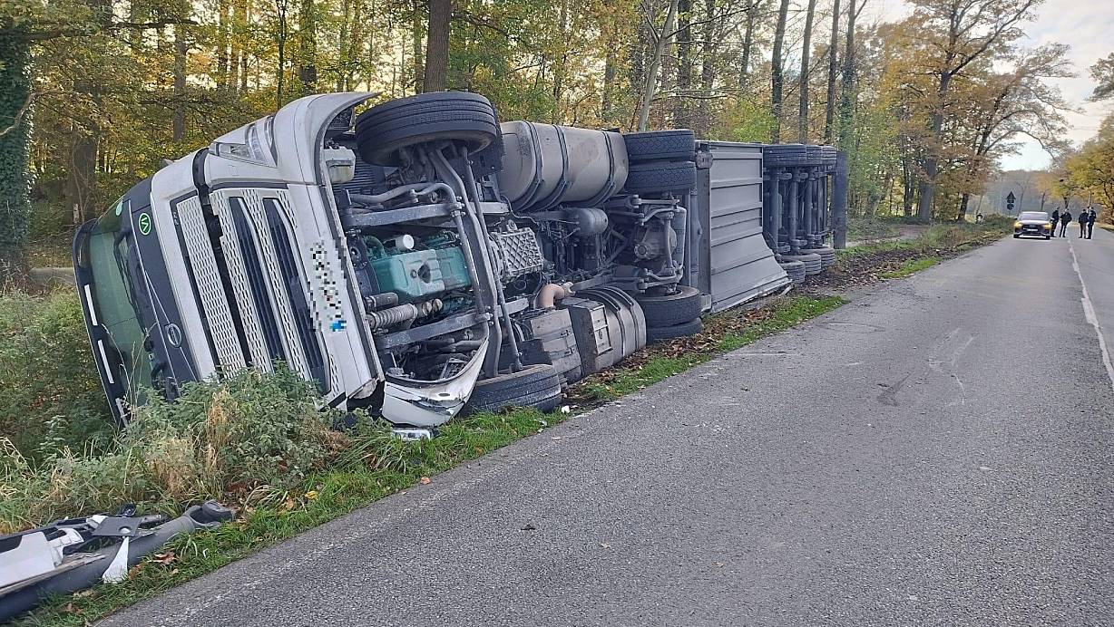 Der Laster kippte naach rechts in den Graben. Die Polizei sperrt seit dem Mittag die Bundesstraße 476 in Versmold,. | © Andre Schneider