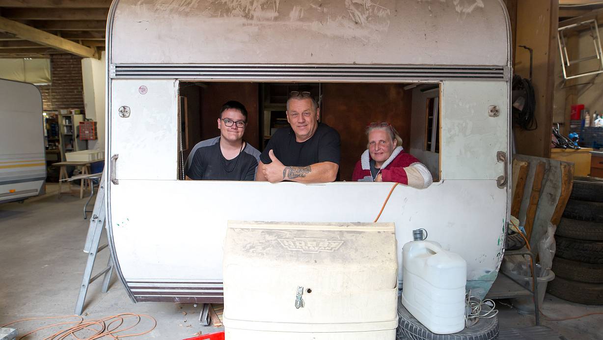 Justin (v. l.), Uwe und Anke Gruhle schauen aus dem Fenster eines Wohnwagens. Bis in das Urlaubsgefährt wieder Leben einkehrt, wird es in der Versmolder Werkstatt aber noch dauern. | © Andre Schneider