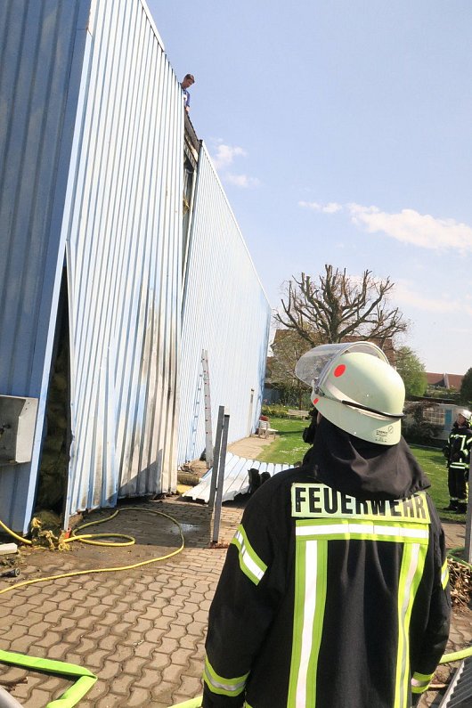 Mehrere Angriffstrupps machten sich unter Atemschutz und mit Wärmebildkameras ein genaues Bild vom Geschehen im Inneren der Halle. Darüber hinaus entschieden sich die Kameraden, die Verkleidung der Halle aufzureißen. Dabei galt es, mit viel Augenmaß und Manpower meterhohe Metallelemente abzutragen.