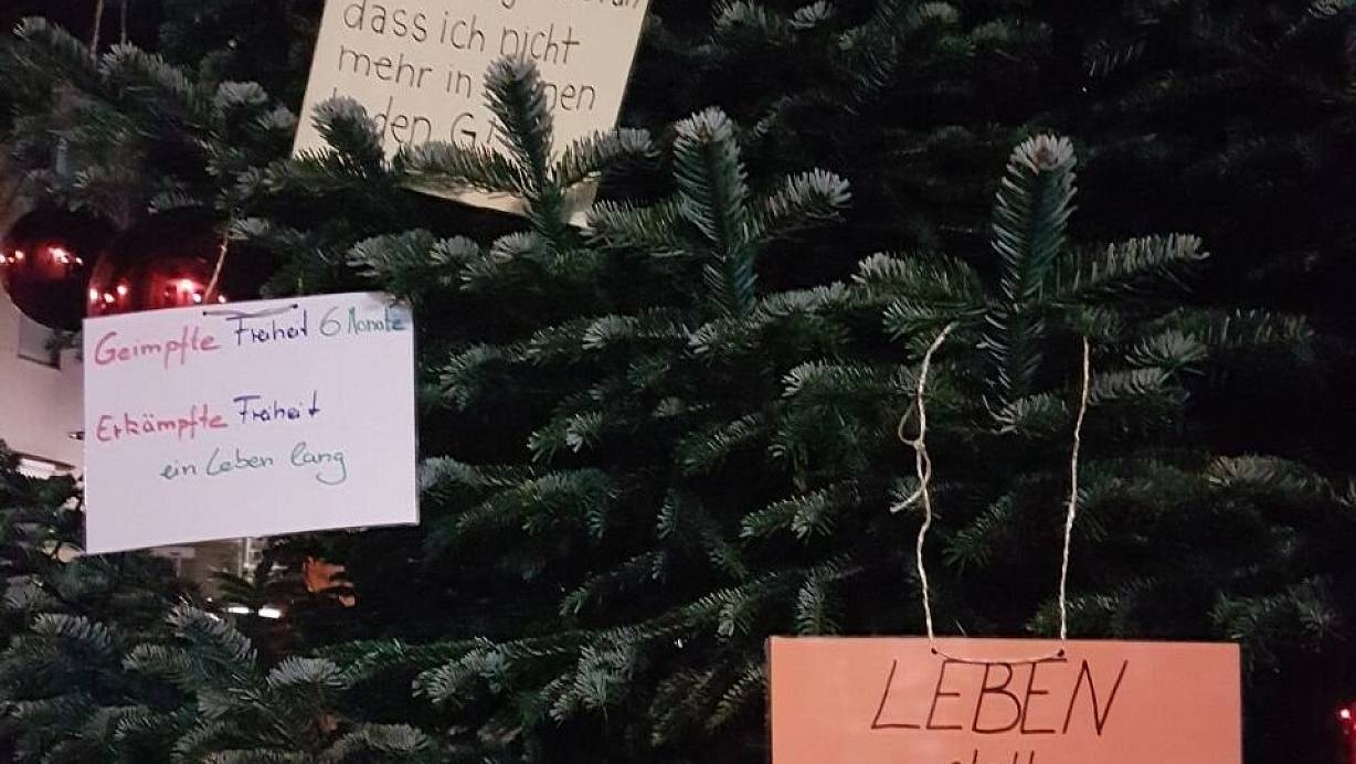 Keine Demo, kein lauter Aufmarsch: Im stillen Protest wählen Unbekannte den Weihnachtsbaum zum Anbringen ihrer Botschaften. Die Stadt lässt die Zettel unmittelbar wieder entfernen. Sie hat nicht gegen einen politischen Diskurs. Nur nicht an dieser Stelle.