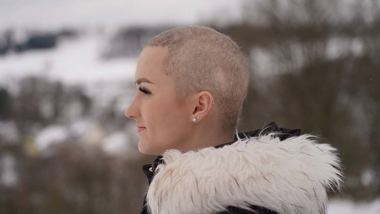 Julia Fischer ist angehende Physiotherapeutin. Sie hat ihr Schicksal angenommen. Ihr Freund Kilian Kunz rasierte ihr die wenig verbliebenden Haare zu einer Glatze. | © Privat/Julia Fischer