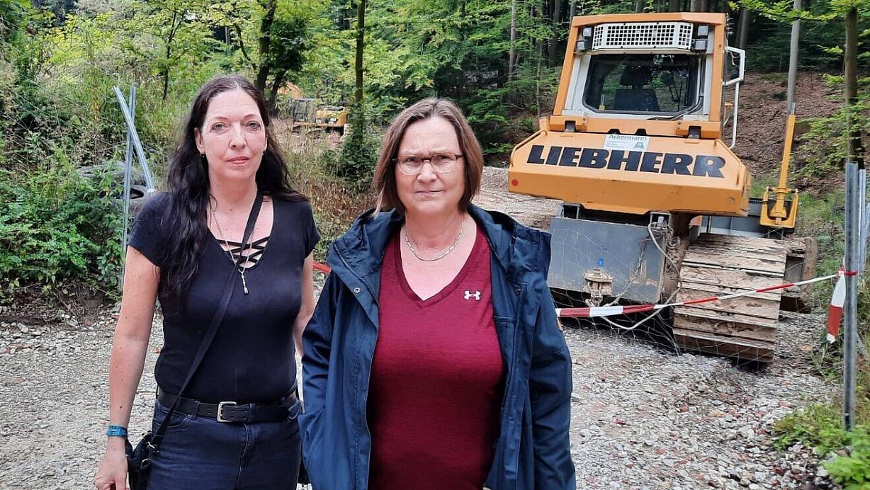 Birgit Lutzer (l.) und Andrea Groß vom BUND vor einem der Radlader, die den großen Reitplatz aufgeschoben haben. Der Zugang zur Reitanlage am Bergkamp ist derzeit gesperrt. | © Jonas Damme