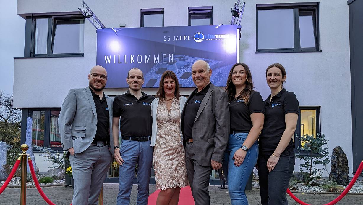 Firmenchef Jörg Lünstedt (4.v.l.) und seine Frau Karen (3.v.l.) können mit Recht stolz sein auf das, was sie geschaffen haben. Alle vier Kinder arbeiten im Unternehmen mit: (v.l.) Björn und Sven Lünstedt sowie Mona Schwarz und Sina Kloidt. | © Anja Hanneforth