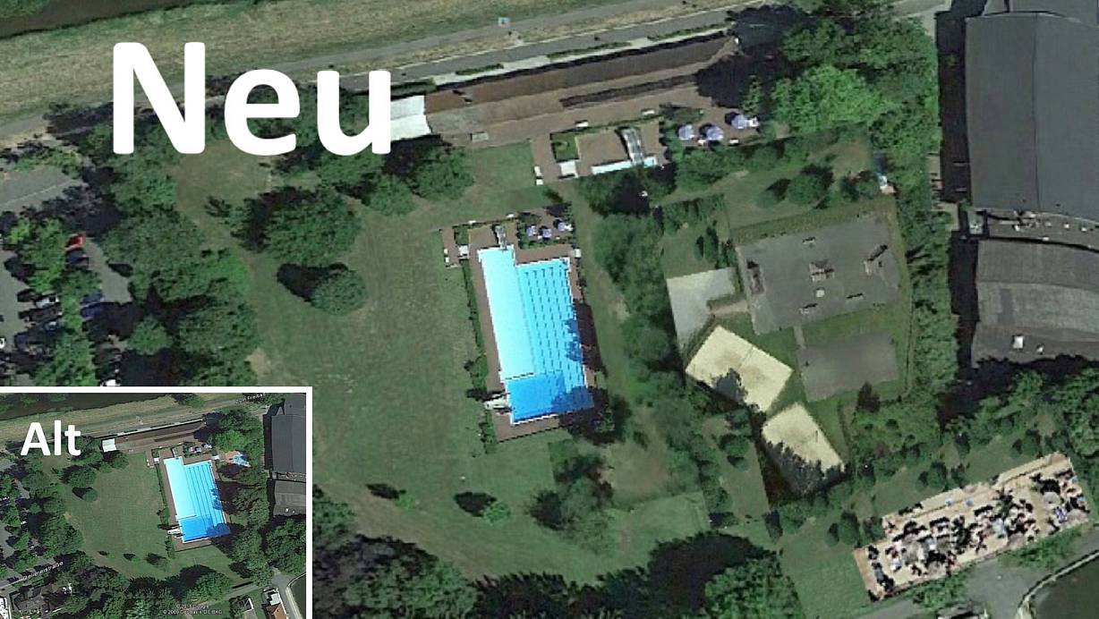 Heinz-Georg Beneke schlägt vor, ein kleineres, 25 Meter langes Becken zu bauen und und die Skateranlage sowie zwei Beach-Volleyballfelder (im großen Bild rechts) ins Freibad zu integrieren.  Zum Steinmeisterpark hin soll eine Strandbar entstehen (rechts unten). Links: Im kleinen Bild der aktuelle Stand. | © NW