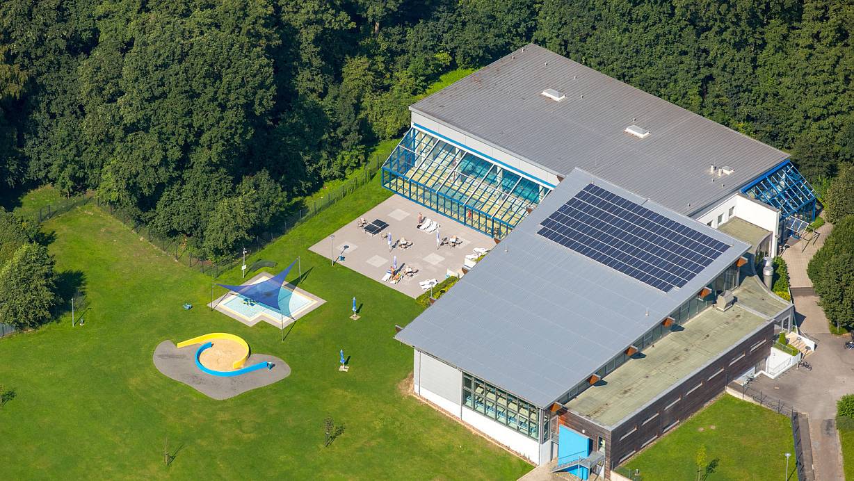 Die beiden Hallen der Welle. Auf der Freifläche unten gäbe es genügend Flächen für ein größeren Schwimmbecken im Freien. | © Hans Blossey
