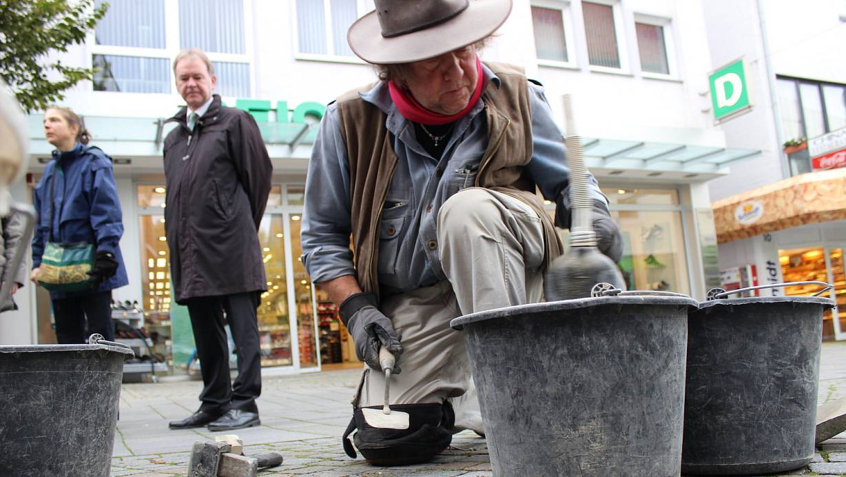 Mit einem Stein wird an Mathilde und Ernst Friedlich gedacht. Der Stein wird gegen 15.45 Uhr in der Straße Auf?m Tie 3 eingelassen.
