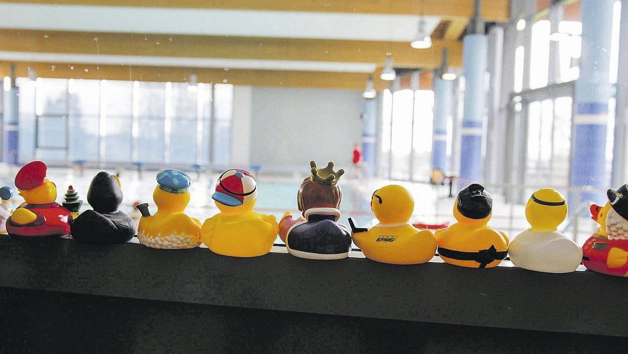 Wie Hühner auf der Stange: Etwa 50 Gummienten schauen vom Arbeitsplatz der Schwimmmeister aus ins Becken - Mitbringsel von Badegästen. Im Hintergrund macht Benjamin Mettenbrink seinen Routinegang ums Becken. | © Meiko Haselhorst