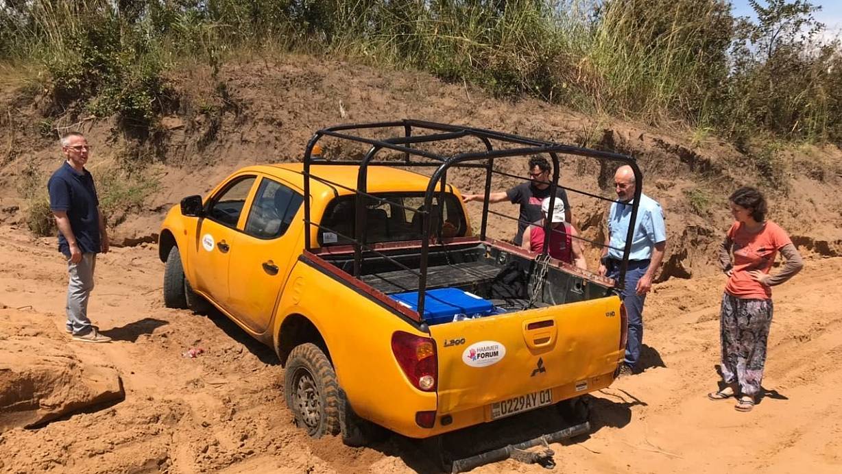 Zwangspause: Auf dem Weg in ein Waisenhaus hat sich der Wagen des Hammer Forums festgefahren. Dr. Emma (im hellblauen Hemd) und die anderen sehen sich das Malheur an. Fotos: hammer Forum | © Meiko Haselhorst