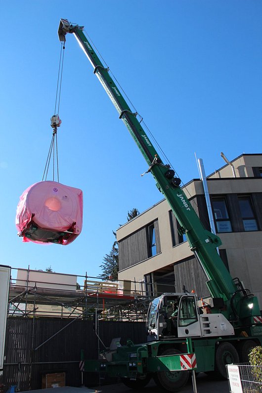 In der vergangenen Woche schwebte per Kran das Herzstück einer Radiologie ein: der Magnetresonanztomograph (MRT), der im Volksmund auch oft „Kernspin“ genannt wird. Dafür mussten die Techniker ein großes Fenster vorübergehend ausbauen, um den 4,5 Tonnen schweren Magneten in die erste Etage zu heben, wo er seit einer Woche installiert wird. Unbekannt ist die Diranuk in Bünde nicht, denn die Gemeinschaft ist an der Brunnenallee schon mit einem Herzkatheterlabor vertreten.