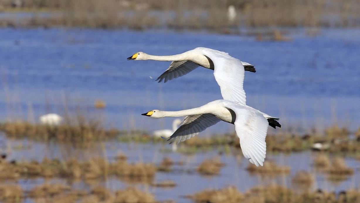 Elegante Flieger: Singschwäne überwintern jedes Jahr zu Tausenden im Vogelschutzgebiet Weseraue. | © picture alliance / imageBROKER
