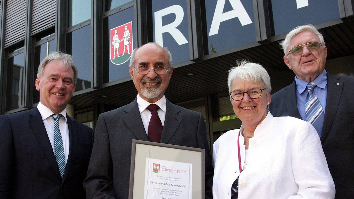 Vorm Rathaus: Bürgermeister Wolfgang Koch (v.l.) Theophylaktos Emmanouilidis mit seiner Frau Ulrike und Ernst Tilly von der FDP-Fraktion, die die Ehrenbürgerschaft beantragt hatte. | © Meiko Haselhorst