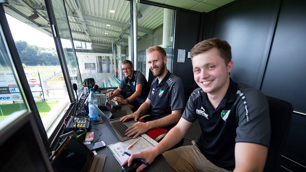 „Die meisten arbeiten hier ehrenamtlich", berichtet Max Moldehn. Zum weiteren Team zählt noch Lea-Marie Steinkamp, die auf fussball.de einen Liveticker führt sowie Joel Beinke und André Vogt, die Fotoerinnerungen vom Spielfeld exklusiv für den Verein erstellen. Eine Etage darüber sorgt Lennart Kränke auf dem mit dem Banner von Radio Herford geschmückten Turm auf der Gegengerade für Videomaterial. Am nächsten Tag erscheinen seine Spielhighlights von durchschnittlich sechs Minuten auf der YouTube-Plattform des Vereins – unterlegt mit Moldehns Stimme.