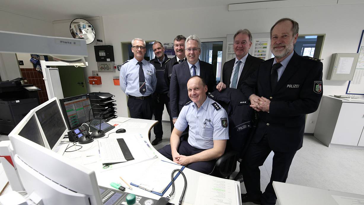 Axel Böker (v. l.), Volker Lippert, Kreisbrandmeister Bernd Kröger, Landrat Jürgen Müller, Ingo Wenge (sitzend), Bürgermeister Wolfgang Koch und Polizeichef Dirk Zühlke. | © GERALD DUNKEL