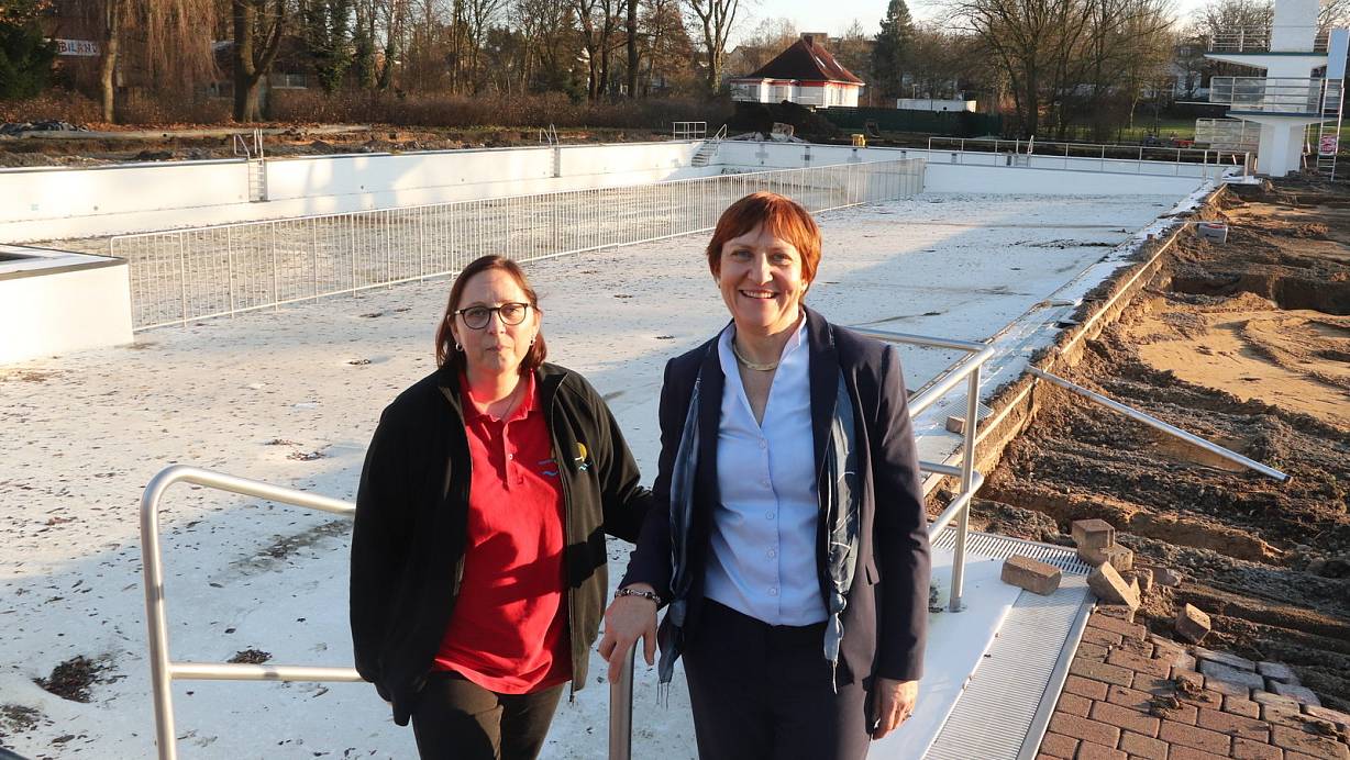 Badleiterin Kerstin Lech (l.) und Marion Kapsa, Chefin der Energie- und Wasserversorgung Bünde, stehen vor dem leeren Schwimmerbecken im Freibad Bünde. | © Niklas Krämer