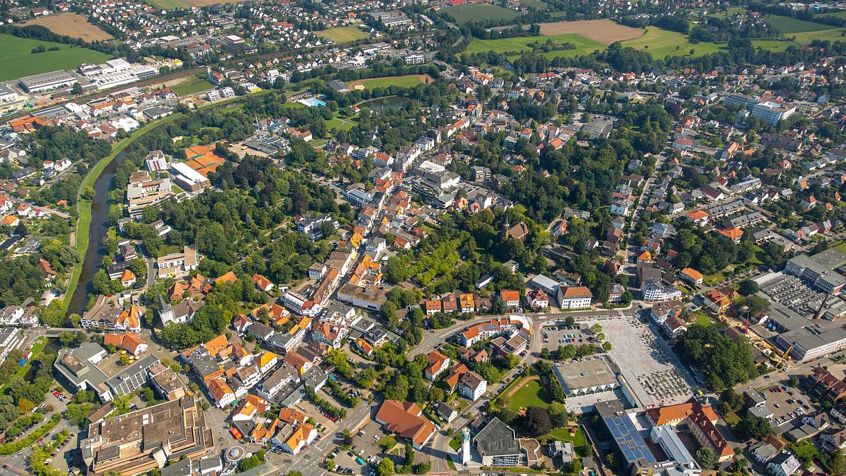 Blick von oben auf die Bünder Innenstadt: Rechts der Marktplatz, unten links Woolworth und Rathaus, links davon fließt die Else. Im Norden ist der Steinmeisterpark und das Freibad zu erkennen, dazwischen zieht sich die Eschstraße. | © Hans Blossey