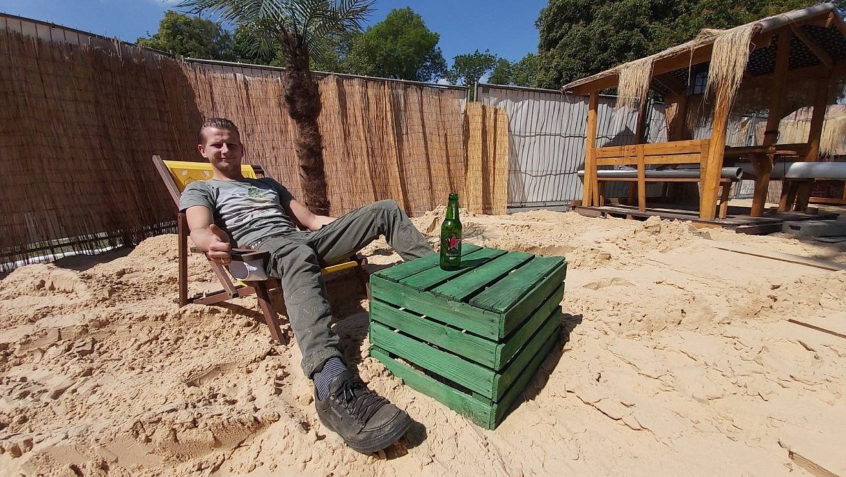 Patrik Weber sitzt im Liegestuhl der Tiki-Bar. Am Freitag, 5. Mai, können die Bünder im Steinmeisterpark erstmals wieder Strandbar-Feeling genießen. | © Florian Weyand