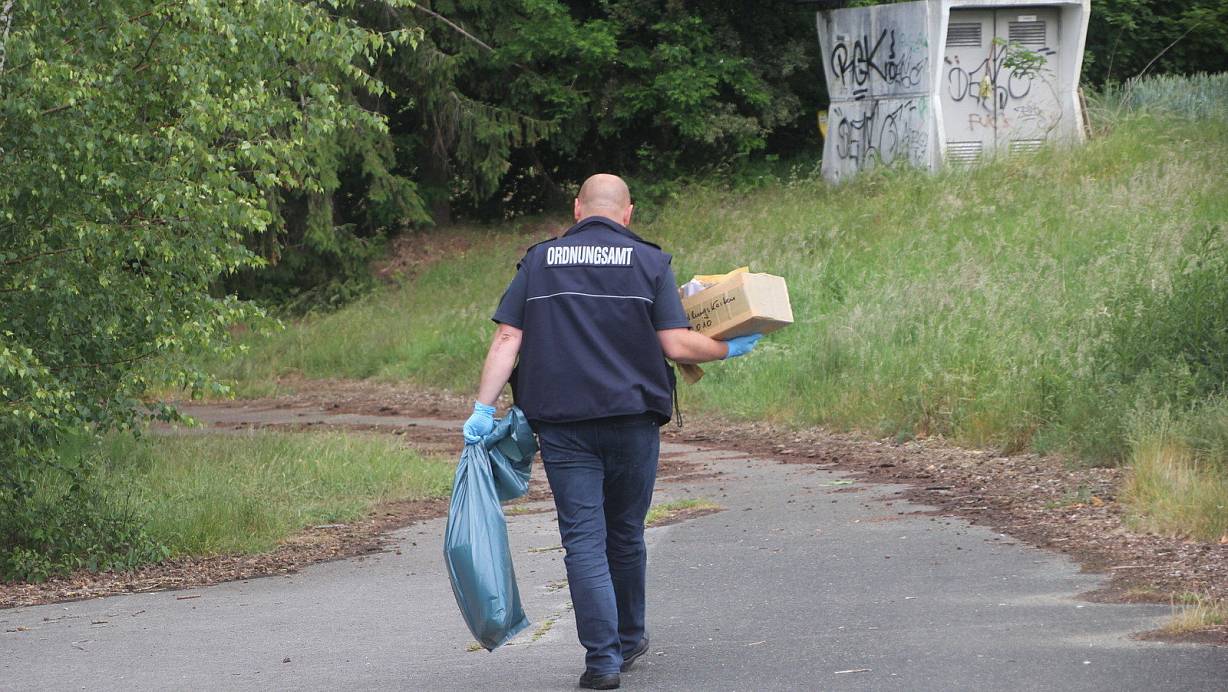 Ein Mitarbeiter des Bünder Ordnungsamts trägt einen blauen Sack und einen Karton voller Papiere aus dem alten Kurhaus im Ortsteil Randringhausen. | © Florian Weyand
