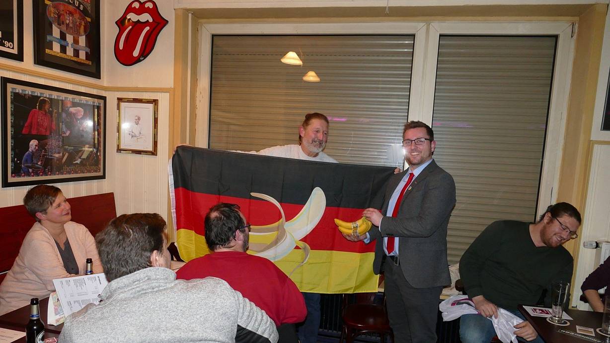 Liebesgrüße aus Paderborn: Der dortige Kreisvorsitzende von DER PARTEI Pierre (Philipp) Schelper (rechts an der Fahne) , im Partei-Anzug, übergibt Bananen an Jürgen Stöhr. | © Florian Weyand