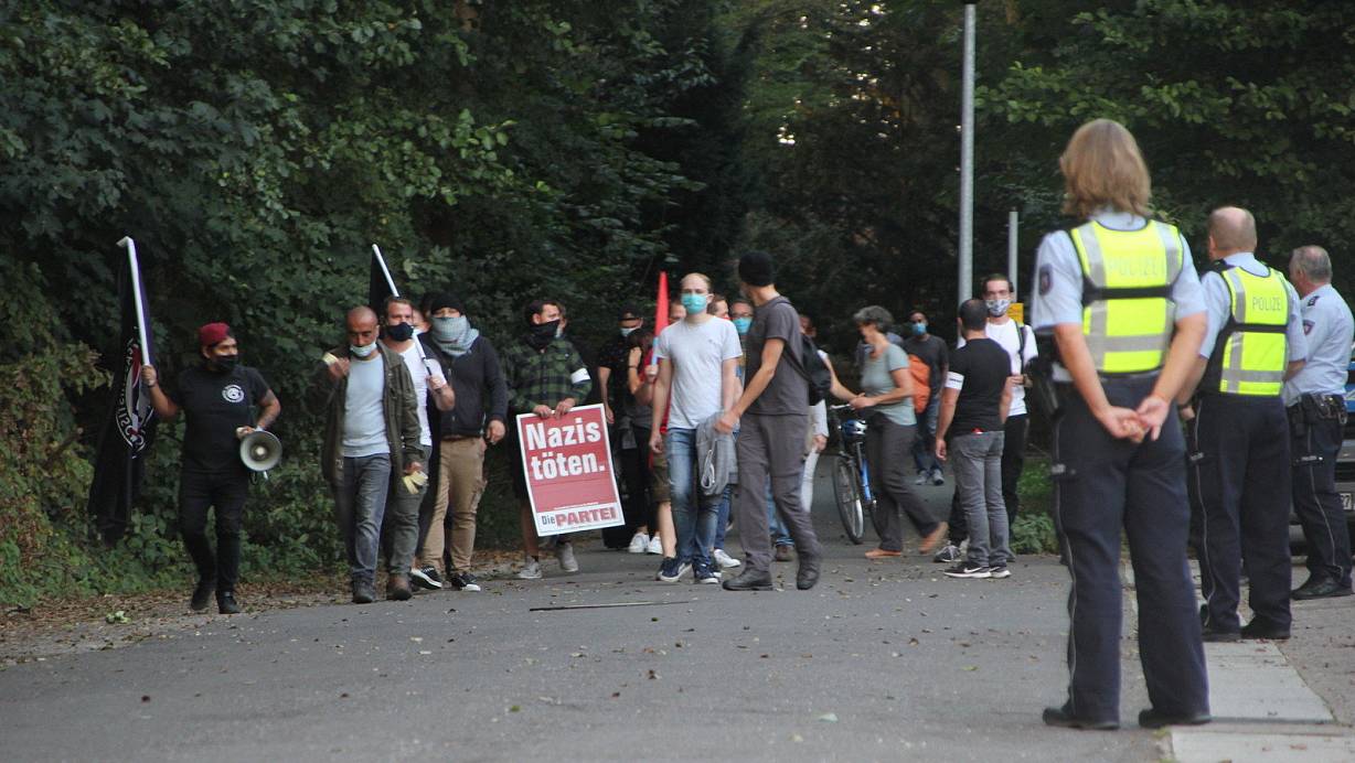 Etwa 20 Demonstranten marschieren vor dem Restaurant "Leib und Seele" in Bünde auf. Sie werden bereits von der Polizei erwartet. | © Florian Weyand