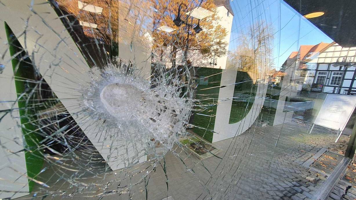 Unbekannte Vandalen zerstörten diese Scheibe des Bünder Stadtmarketing-Büros. | © Gerald Dunkel