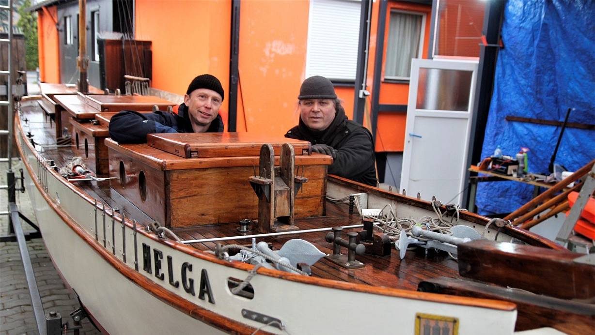 Torsten Wittenberg (r.) und Uwe Fleer verbringen zurzeit viele gemeinsame Stunden mit ihrer Helga. Fleer hat fürs Bild schon mal im Boot Platz genommen. Allzu viel Platz ist hier nicht. | © Meiko Haselhorst