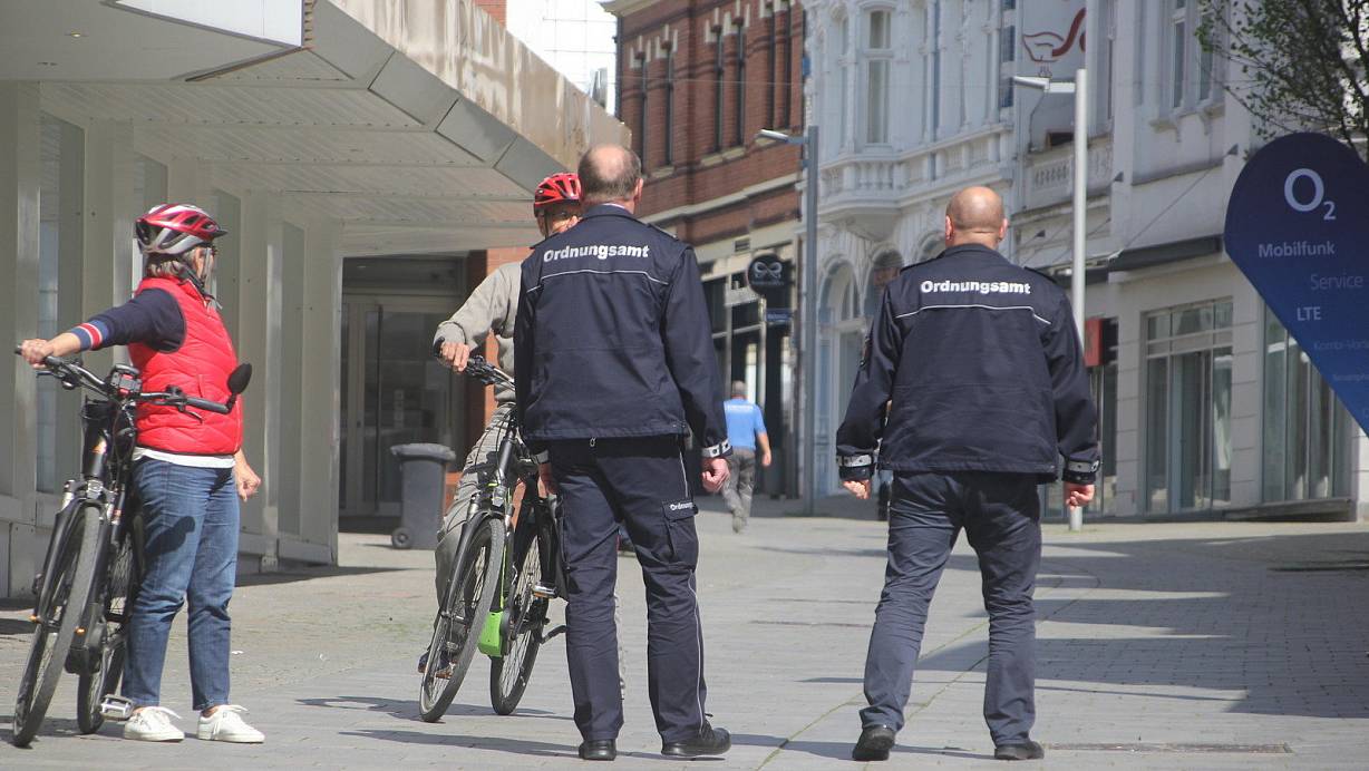 Zwei Mitarbeiter vom Ordnungsamt Bünde gehen in der Eschstraße auf Streife. | © Florian Weyand