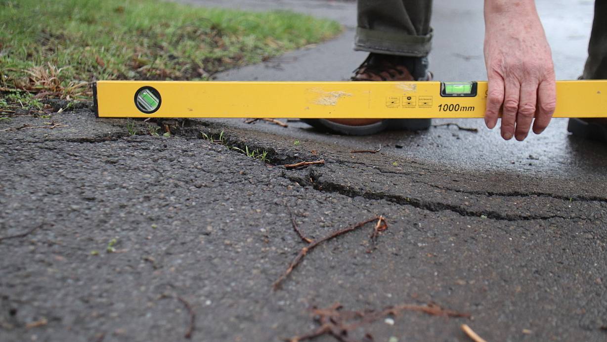 Mit einer Wasserwaage dokumentiert Johannes Lübeck die Unebenheiten des Radwegs an der Wiehenstraße. | © Björn Kenter
