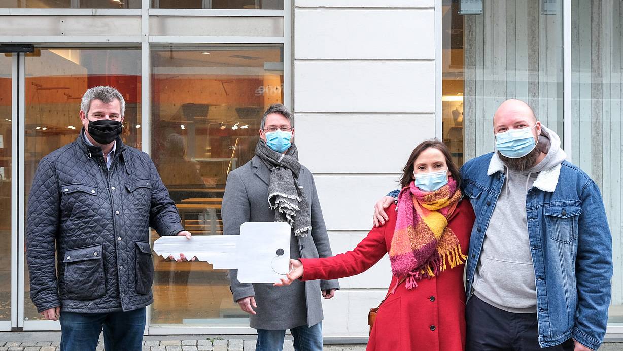 Symbolische Schlüsselübergabe: Carsten Becker (Inhaberfamilie), Ralf Grund (Stadtmarketing) sowie Maren und Axel Zobel („Sweet Rockin‘ 50s“; v. l.). | © Stadtmarketing Bünde/Karl-Hendrik Tittel