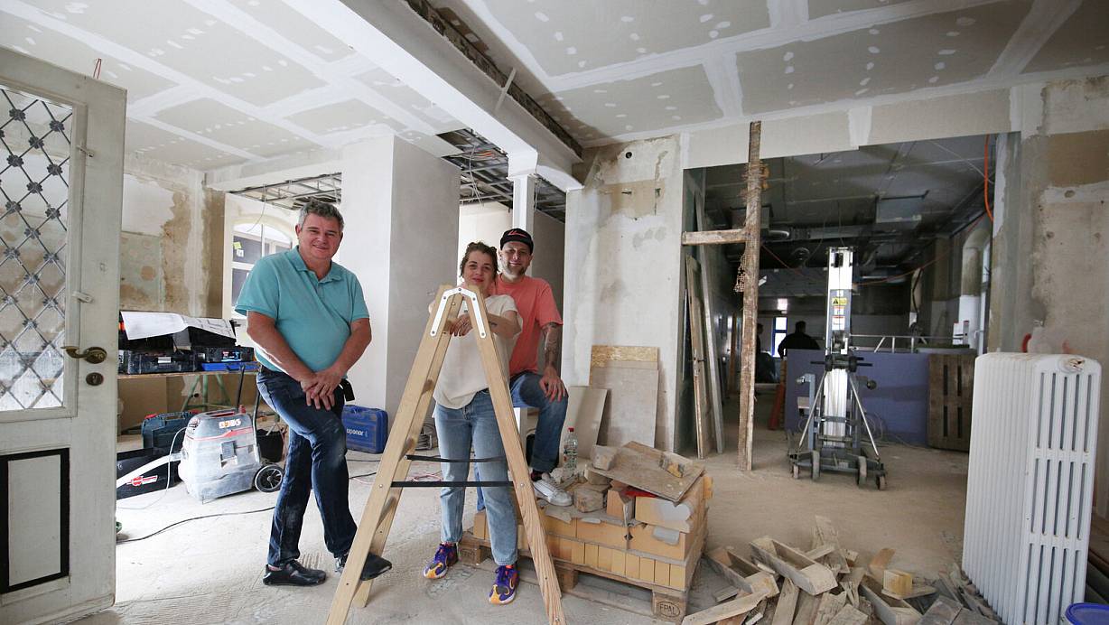 Restaurant soll in die Alte Apotheke einziehen. Bauherr Carsten Becker (v. l.) mit Sian Claire Roberts und Marc Lach. | © Gerald Dunkel