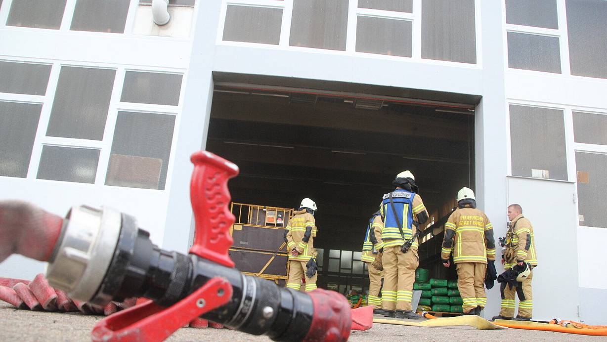 Ein Zeuge meldet am Morgen Rauch aus einer Lagerhalle in Bünde. Mit Hilfe von Atemschutzgeräten dringt die Feuerwehr in das Gebäude ein.