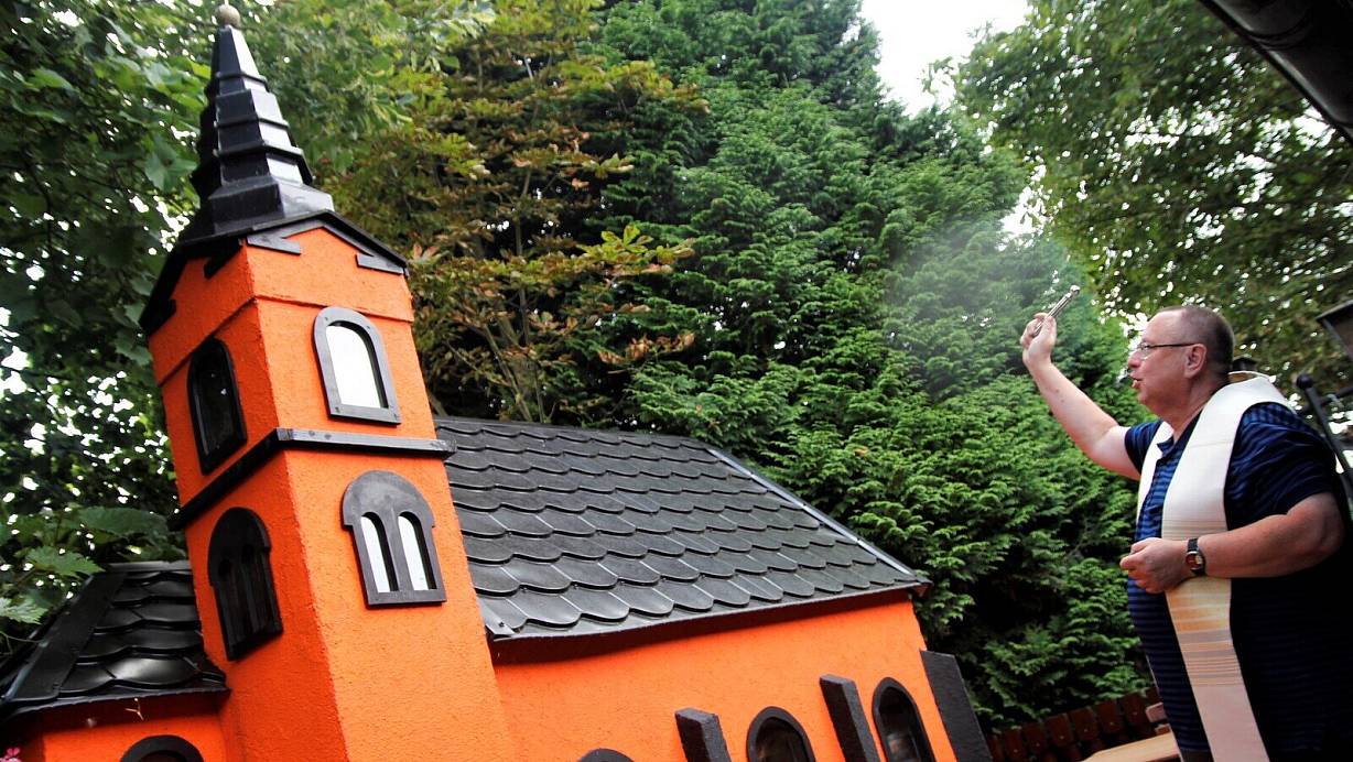 Torsten Wittenberg, besser bekannt als "Metzger mit dem Zopf", hat im Außenbereich seines Restaurants eine Miniaturkirche stehen. Nun hat Bündes katholischer Pfarrer Wolfgang Sudkamp das Gebäude gesegnet - und denkt sogar noch ein bisschen weiter.