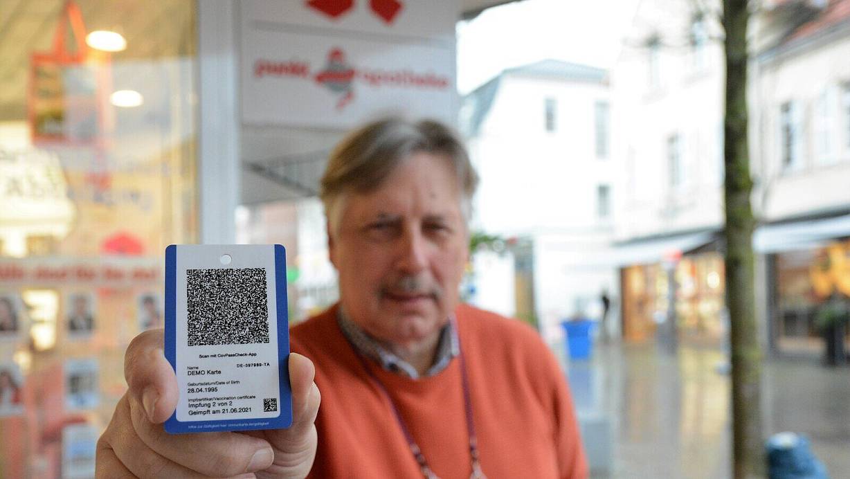Apotheker Reinhard Rokitta von der Punkt-Apotheke zeigt ein Demoversion der Immunkarte | © Sven Hauhart