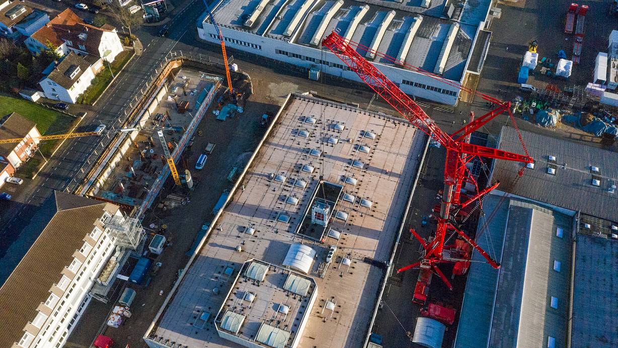 Ein besonders starker mobiler Schwerlastkran lässt eine der etwa 150 Tonnen schweren Pressen nach der anderen in die Halle hinab. Fotos: Miele | © Foto: Miele