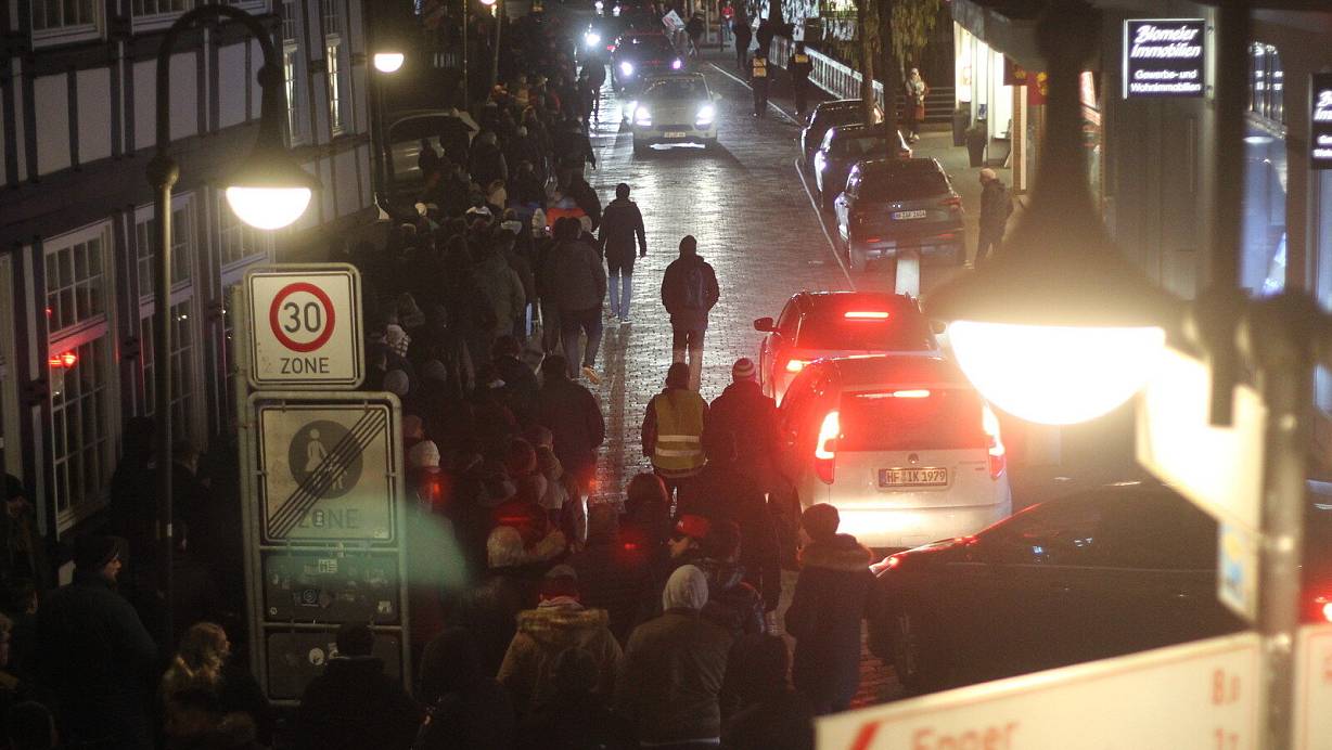 Ein Porsche-Fahrer stoppt an der Bahnhofstraße und hupt, als die "Spaziergänger" vorbeigehen. | © Florian Weyand