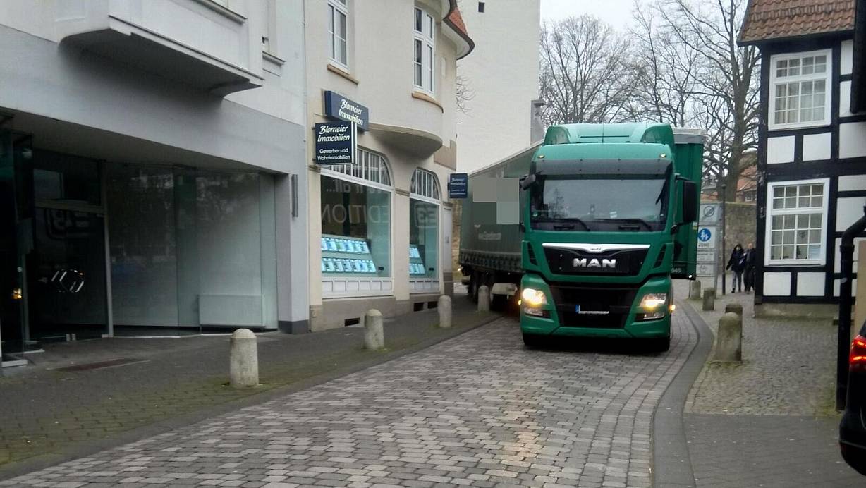 Kein Durchkommen mehr an der Ecke Nordring/Bahnhofstraße: Ein Lkw hat sich am Mittwochmittag in der engen Kurve festgefahren.