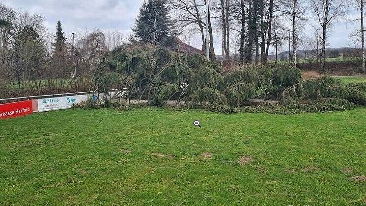Am Rasenplatz des VfL Klosterbauerschaft hat es mehrere Bäume umgerissen. Die Kabine der Heimmannschaft hat es umgehauen, teil der Verein mit. | © VfL Klosterbauerschaft
