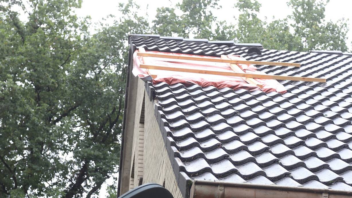 Ein Ast hat ein Wohnhaus beschädigt. Ein Loch im Dach ist mit Planen notdürftig geflickt. | © Susanne Barth